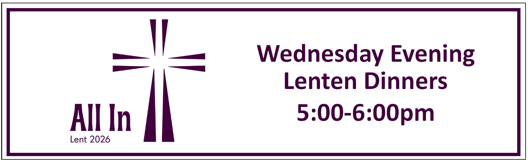 Beginning February 25th, join us every Wednesday night (last dinner is March 25th) in the Gathering Area for dinner ($5/person) from 5:00-6:00 p.m. Followed by Bible studies and conversations designed for various age groups.